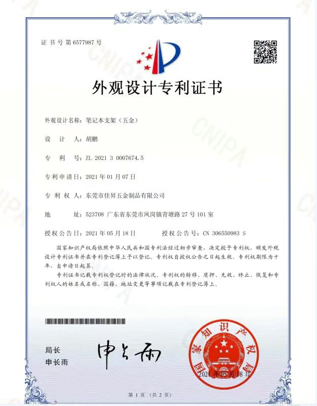 ◆ 專利權(quán): 擁有8項由國家知識產(chǎn)權(quán)局頒發(fā)的外觀設(shè)計專利證書